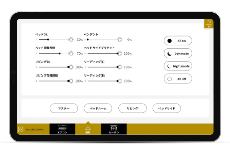 タブレットから照明・空調・カーテン・床暖房などが制御できます。ゲストはリモコン、スイッチで操作する必要なくタブレット1台でお部屋の環境を自由に操作でき滞在満足度向上が期待できます。