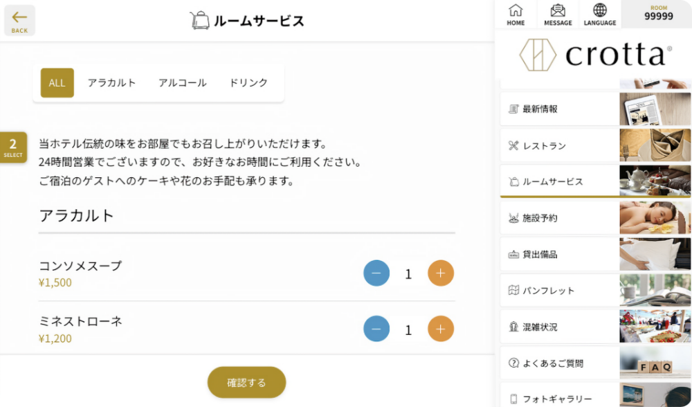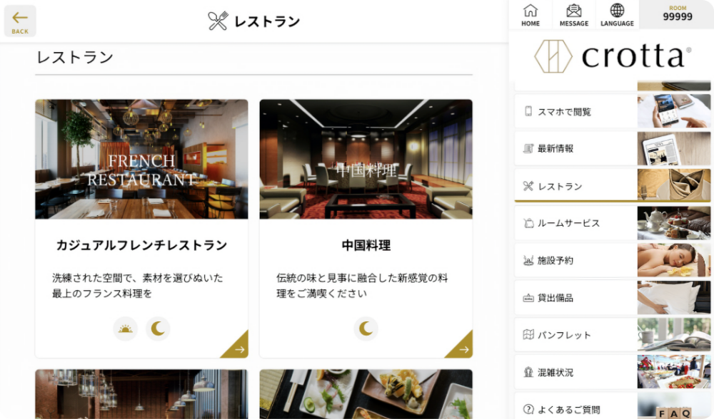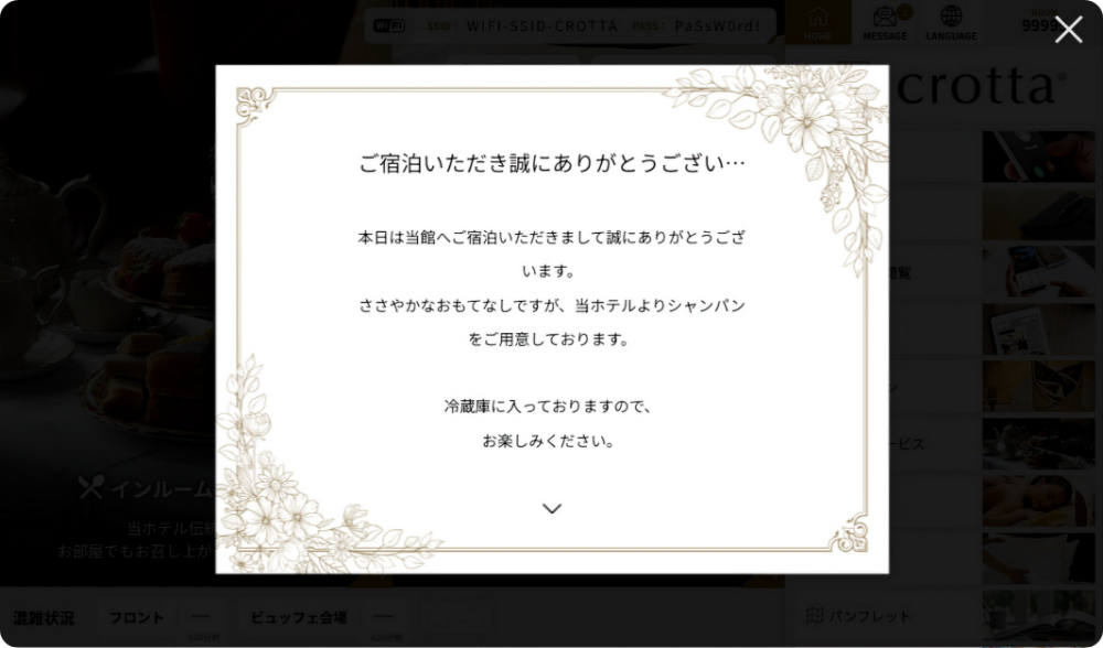 「客室タブレットcrotta」の導入ですべての印刷物がデジタル化されたのですが、印刷コストはもちろんゼロ、清掃もタブレットを拭くだけ、新しい情報も管理画面から登録するだけだし、さらにリアルタイムで発信もできてしまう嬉しいばかりの状況になりました!
